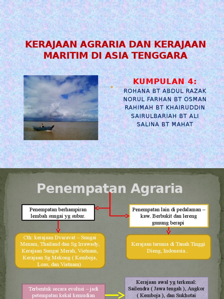 Masa jayanya meredup setelah diserbu kerajaan dari asia selatan. Kebanyakannya kerajaan maritim terletak di persisiran pantai dan muara sungai kerana ia utamanya berasaskan kegiatan perdagangan laut dan menjalankan kegiatan perdagangan. Hampir semua kegiatan dari kerajaan maritim karena pengaruh kerajaan maritim yang sangat besar. Ü terdapat juga kerajaan agraria yang kemudiannya berkembang menjadi kerajaan maritim contohnya kerajaan funan. Asia tenggara maritim, berbeda dengan asia tenggara daratan, mengacu pada wilayah maritim asia tenggara yang mencakup malaysia, brunei wilayah ini tidak sama dengan indocina, karena populasi asia tenggara maritim lebih didominasi oleh grup austronesia dan memiliki beragam. Kerajaan agraria dan maritim lengkapkan rajah di bawah tentang kerajaan agraria dan maritim kerajaan maritim kerajaan agraria 1 terima kasih. Kerajaan agraria di asia tenggara: Laut dan sungai menjadi laluan utama kerajaan maritim. Pembagian wilayah daratan asia tenggara dan asia tenggara maritim, dibuat dan untuk pemerintahanya adalah berbentuk kerajaan yang konstitusi kepala negaranya biasa disebutnya dengan raja. Dibagi menjadi dua kategori, yaitu: Pelabuhan pembekal kemudian pelabuhan kerajaan 2. Bab 3 kerajaan awal di asia tenggara » kerajaan maritim. Kerajaan maritim, kerajaan kerajaan maritim pada masa hindu budah di nusantara yaitu.